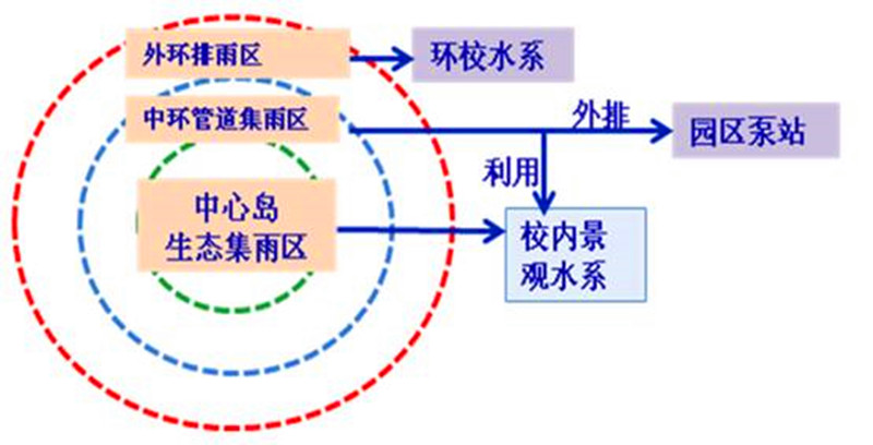 以北洋园校区为例,根据布局和功能,校园分为三个雨水排放分区,分别为外环自然排雨区、中环管道集雨区和中心岛生态调蓄区。