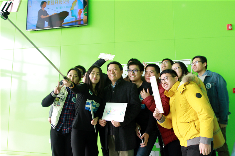 傅振邦参观天大“搭伙”众创空间与创业团队合影留念