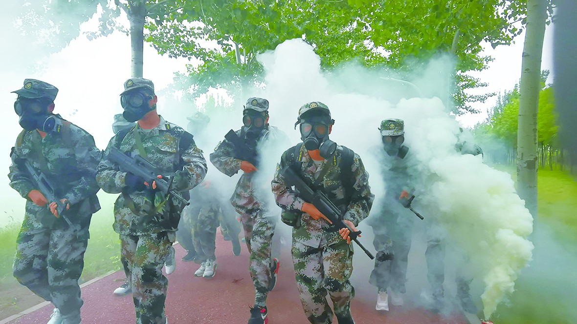 他们单手持枪、用湿毛巾捂住口鼻,躬身跑出毒气笼罩的区域。危机四伏,而同学们却临危不乱,冷静镇定地回忆教官教学的内容,尽可能保护自己的生命健康。
