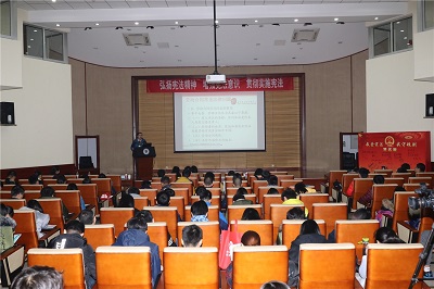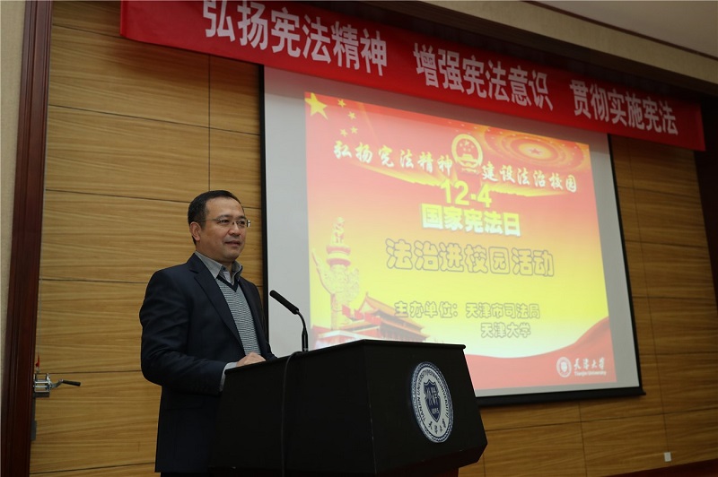 上午九点,法治进校园活动正式开始,雷鸣致辞。她谈到天津大学和天津市司法局联合开展法治进校园活动是一次积极有益的合作,体现了市司法局一直以来对学校依法治校工作的关心和支持,她代表学校对出席本次活动的市司法局领导和七五普法讲师团的律师代表表示感谢和欢迎。借助国家宪法日的良好契机,她向全体师生发出倡议:“希望全体师生积极参加国家宪法日法治宣传教育活动,认真学习宪法法律知识,增强法治观念,争做遵纪守法的合格公民。认真学习《天津大学章程》和校规校纪,严以律已,养成良好的品行习惯,为营造安全、文明、和谐的法治校园而努力!”