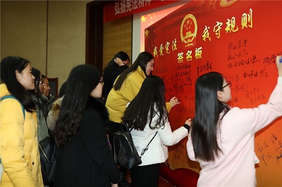 市司法局法制宣传处为本次活动精心准备了宪法手册、预防电信诈骗宣传手册和挂图等法治宣传资料。雷鸣、魏东、杜丽萍、徐万鹏四位领导为师生代表逐一颁发了法治宣传资料,并在“我爱宪法、我守规则”签名板上进行签名晒出自己的守法承诺。