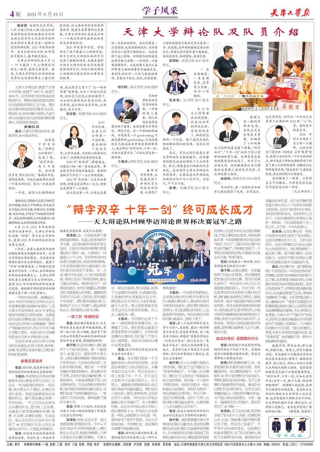 2021年秋季开学前,学校传来了这个振奋人心的好消息,师生们对天大辩论队和辩手们充满了敬佩和好奇。本报本期将介绍天大辩论队和为学校赢得荣誉的辩手们,听他们讲述那惊心动魄的比赛过程和比赛背后的故事。