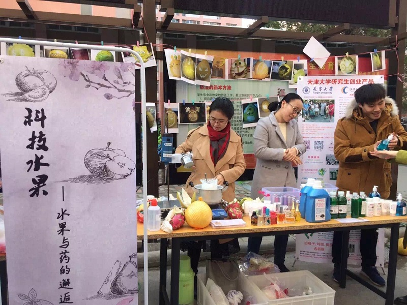 活动现场,药学院的学生采用压榨法,从柚子皮中提取精油。有的添加到手工护手霜里,有的用来调配成空气清新剂,既环保又健康。该活动是由天津大学药学院的创业团队发起,活动负责人高雅博介绍说:“一方面向大家科普化工方面的知识,帮助同学将科技和生活更好地结合起来,另一方面也将天津大学药学院的科研成果更好地传播给公众。”