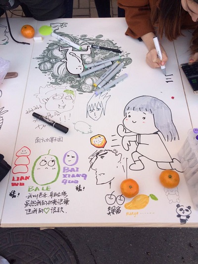 “不仅可以亲手制作柚子茶,还有现场素描画像可以领!”在天津大学北洋园校区,天津大学对口支援的甘肃宕昌县的工作人员正在现场义卖蜂蜜,很多艺术专业的同学听说后,自发利用专长为献爱心的同学画人物肖像。据了解,甘肃省宕昌县的农民正在因农产品滞销而发愁。借助水果节的契机,对口支援宕昌地区的天大师生希望通过这一活动,将无公害的宕昌土特产销售出去,帮助当地群众脱贫致富。“还是希望能为贫困县的农户出点力,也希望这份爱心能够通过我们的作品传递下去。”正在现场作画的同学说。