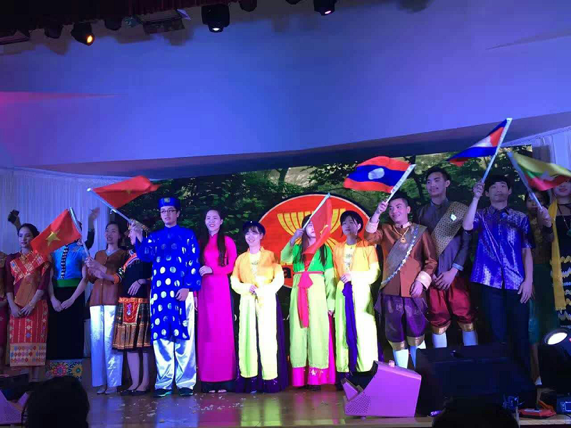 来自东盟10国的168名留学生,以歌曲、舞蹈、杂技、乐器演奏、服装秀和武术表演等多种形式,向在场观众展示了东盟各国独具特色的民俗文化和风土人情。中国与东盟各国一衣带水、唇齿相依,整场晚会以“和谐东盟”为主题,充分彰显了当代中国青年与东盟学生间的深厚友谊,以文化为载体集中展现了中国与东盟国家在高等教育领域合作中所取得的丰硕成果。