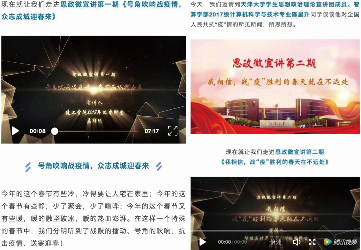 海量搜索凝练素材,字斟句酌打磨讲稿,声情并茂朗诵解说,千锤百炼编辑影音,全新的宣讲模式使学生主讲人进一步研究理论、掌握技术、吃透时政、拥抱时代。每周一期微宣讲,每期10分钟。用喝一杯茶的时间,听一堂同龄人带来的网络思政课,俨然成为天大学子新的“必修课”。