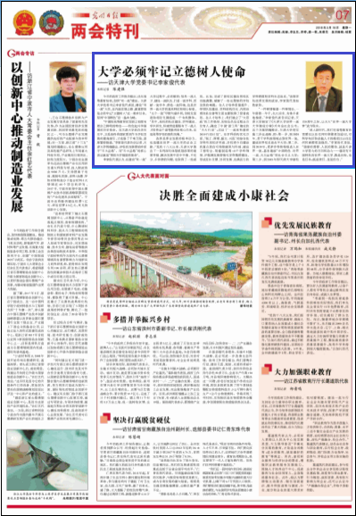 今年的政府工作报告提出,优化高等教育结构,加快“双一流”建设。天津大学党委书记李家俊代表说,建设“双一流”大学,走内涵发展之路,最重要的是必须牢记“立德树人”这一根本任务,坚持“中国特色”这一基本方略。
