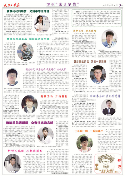 我校“学生科学奖”于2002年正式开始评选,在天大校园中享有学生“诺贝尔奖”的美誉,旨在活跃校园科技氛围,培养并提高学生科技素质,选拔优秀科技人才,以榜样的力量激发和鼓舞广大青年学生投身到科技创新中来。2016年第15届“学生科学奖”11月启动,16个学院/学部的31名同学参赛,历经初评、相关专家分头书面评审,有21名脱颖而出进入校级终审。经学校审定,最终有10 名学生获“学生科学奖”。这10名获奖者都是在科研工作中表现突出,取得了优秀科技成果,能够代表天津大学学生科技创新水平的优秀学生。本期4版“学生‘诺贝尔奖’”专版特推出“学生科学奖”专题,介绍10名获得2016年“学生科学奖”的优秀学生的事迹。
