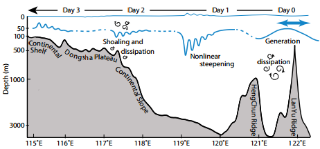 王虎老师在报告中讲解到,海洋内波的产生应具备两个条件:一是海水密度稳定分层,二是要有扰动能源,两者缺一不可。以南海东北部海域为例,大洋传来的潮波通过吕宋海峡时,受到恒春、兰宇两个陡峭海脊的激发而产生内波,向南海东北部陆坡和陆架传播过程中发生非线性深化,在到达东沙高原时候由于水深变浅,而耗散、衰减,从下凹型变为上凸型,并最终消亡于陆架浅海,整个过程大概3天。在这里,强潮是动力源,例如,内波多发生在新月和满月大潮的时候;两个海脊则是必要的地形条件,使潮波发生扰动;稳定层结是必要条件,内波在夏季发生频率高,因为夏季南海强而浅的温跃层有利于内波形成,冬季的深混合层则抑制了内波的产生。