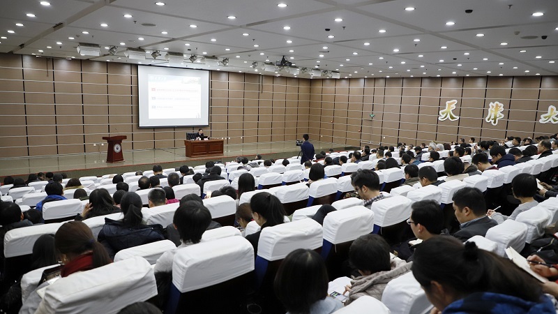 本站讯(通讯员 刘超 摄影 陈晓金)12月19日下午,天津大学深入学习贯彻党的十九大精神专题辅导报告会在卫津路校区天南楼C4报告厅举办。校党委书记李家俊作了题为《贯彻党的十九大精神 加强新时代党的建设 为早日建成中国特色世界一流大学提供坚强组织保证》的报告。报告会由校党委常务副书记舒歌群主持,各院级党组织书记、副书记,教工党支部书记,党务秘书,党委职能部门负责人近400人聆听了报告。