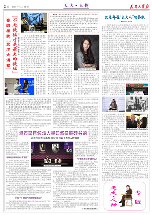 2017年1月5日,从美国传来消息:美国风险投资机构Fusion Fund (又名NewGen Capital)的创始合伙人,天津大学校友张璐入选为风险投资领域2017年福布斯30位30岁以下杰出人物之一。同时,作为30人中的最杰出者,她被福布斯评为该领域的荣誉主题人物,成为福布斯“30 under 30”有史以来首位获此殊荣的华人。