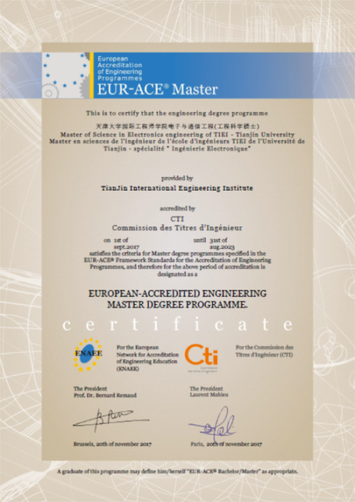 国际工程师学院是天津大学在国家战略发展需求和文化自信的基础上,借鉴法国工程师职衔委员会(CTI)认证体系、欧洲工程教育(EUR-ACE)体系,独立建设的研究生层面的工程教育改革实验区。此次相继通过法国工程师职衔委员会(CTI)认证和欧洲工程教育(EUR-ACE)认证,意味着国际工程师学院电子与通信工程、建筑与土木工程(智能建筑)、计算机技术三大专业领域的毕业生除获得天津大学硕士研究生毕业证和学位证以外,还可不出国门拿到欧洲认可的法国工程师文凭。这既是对学院教育质量的国际认可,也是对国际工程领军人才培养质量的有力证明。