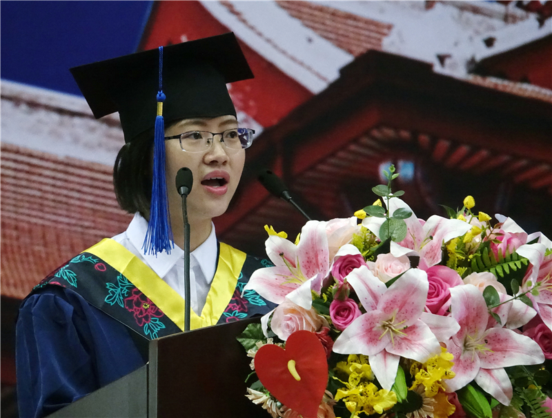 环境学院2015级环境工程专业硕士研究生汤茵琪代表研究生毕业生发言。在天大六年半的求学时光让她见证了天大巨大的发展变化。“‘海燕’号水下滑翔机、C919大型客机的座舱环境控制系统、真核生物酵母长染色体化学再造......”汤茵琪说到,“在‘实事求是’的校训、‘严谨治学’的校风和‘爱国奉献’传统的熏陶下,天大人不断取得新成就。”