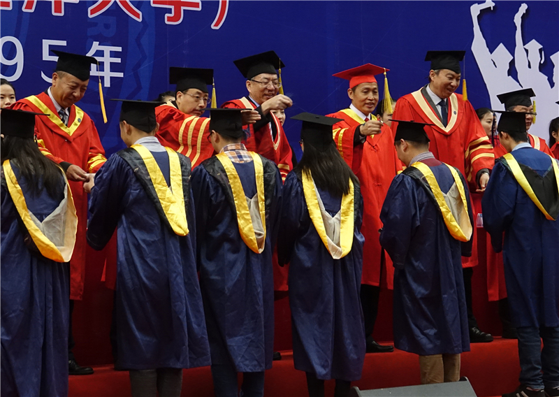 博士毕业生依次走上主席台,由校领导、学位委员会委员代表为他们授予学位、拨动流苏;随后,硕士毕业生依次走上主席台,由校领导、各学院领导和学位委员会委员代表为他们授予学位、拨动流苏。