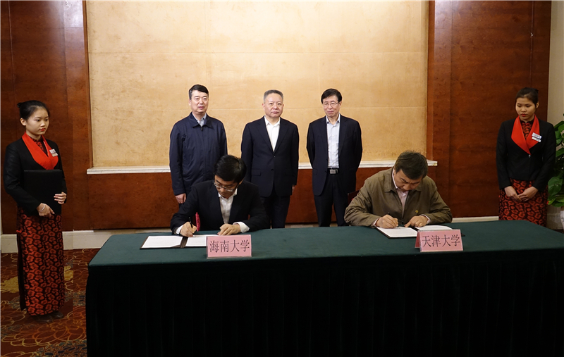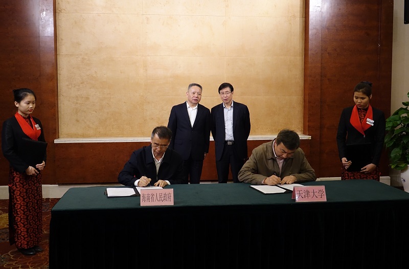 在海南省省长沈晓明、天津大学党委书记李家俊、海南大学党委书记武耀廷的共同见证下,天津大学党委常务副书记舒歌群、海南大学党委常务副书记廖清林分别代表天津大学和海南大学签署《“十三五”天津大学对口支援海南大学协议书》