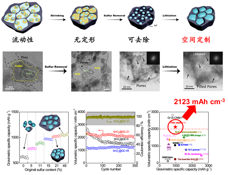 硫模板法的提出,是在三维石墨烯致密网络中,巧妙利用硫如同“变形金刚”一样的流动性、无定形,以及易去除等特点,在碳笼结构内部实现对非碳活性颗粒如二氧化锡纳米颗粒的紧密包覆。与传统的“形状”模板相比,硫模板的最大优势就是能发挥可塑型的体积模板作用,使紧致的石墨烯笼结构能够提供适形且尺寸精确可控的预留空间,最终完成针对活性二氧化锡的“量体裁衣”。这种具有合适预留空间且保持高密度的碳-非碳复合电极材料能贡献出极高的体积比容量,从而大幅度提高锂离子电池的体积能量密度,使锂离子电池变得更小。这种 “量体裁衣”的设计思想可以拓展为普适化的下一代高能锂离子电池和锂硫电池、锂空气电池等电极材料的构建策略。