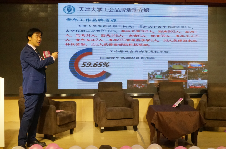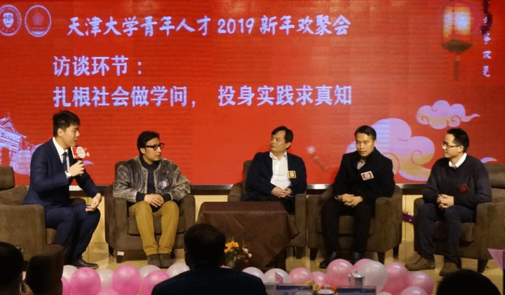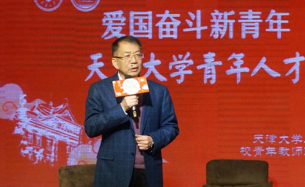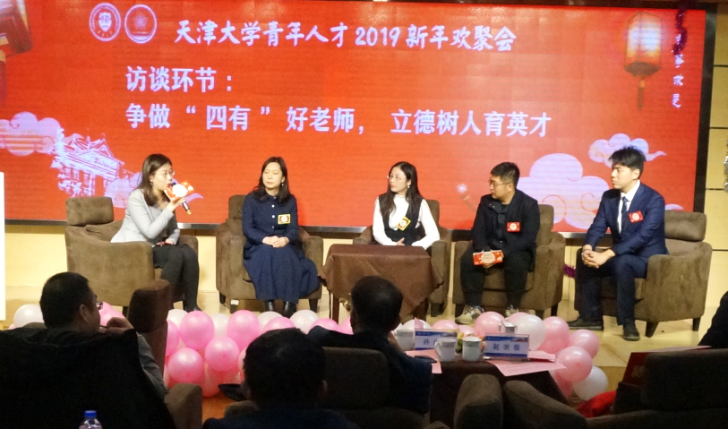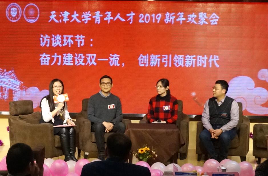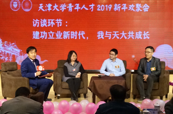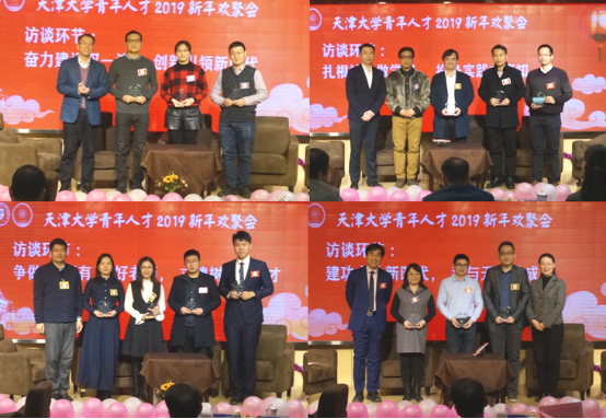 欢聚会设置“科研创新”“潜心育人”“服务社会”“青年成长”四个主题访谈环节,邀请过去一年中在教学科研、社会服务等各个领域取得突出进步的15位青年教师代表进行深度分享,回顾“天大成就”,讲述“天大故事”,展现青年一代的“天大担当”。“科研创新”代表王延辉,通过远程视频介绍了“海燕”水下航行器的特色优势和领先地位,并以投身国家战略、潜心研究和调整创新三点希望与广大青年人才共勉,展现了天津大学青年教师积极进取的精神风貌;“潜心育人”代表辛善超,带领学生团队在威卢克斯国际建筑学生设计大赛中获得世界总冠军,发出了“这么大舞台,我们要有勇气站在上面”的天大声音;“服务社会”代表肖忠,将自己与港珠澳大桥的结缘过程娓娓道来,展示了世纪工程里的天大智慧;“青年成长”代表王晓飞从自身海外学习和工作经历出发,对学校事业发展提出了中肯建议,希望学校加强外部交流和宣传,主动承担起新时代的召唤,加快“双一流”建设步伐;“国家杰出青年科学基金”获得者刘润、“国家优秀青年科学基金”获得者马宗青、国家精品在线开放课程团队负责人关静、登上央视《国家宝藏》节目的样式雷团队成员张龙、天津市第十四届青年教师基本功竞赛工科组特等奖获得者刘艳丽、合成生物学元英进教授团队成员吴毅、医学部教师杨佳佳、获得国家专利金奖的刘铁根教授团队成员刘琨、致力于文物数据采集与数字化工作的韩冬、为沿海环保事业做贡献的刘庆岭、天津市第十四届青年教师基本功竞赛管理干部组特等奖获得者刘超等优秀青年人才也纷纷畅所欲言,分享了他们在科研、教学、社会服务等方面的宝贵成长经验,见贤思齐,凝聚共识,更加坚定了广大青年人才投身于学校“双一流”建设的决心和信心,赢得现场阵阵掌声。孙广平、赵美蓉、贾启君等与会嘉宾为他们颁发了荣誉牌,勉励他们在新的一年继续建功立业。