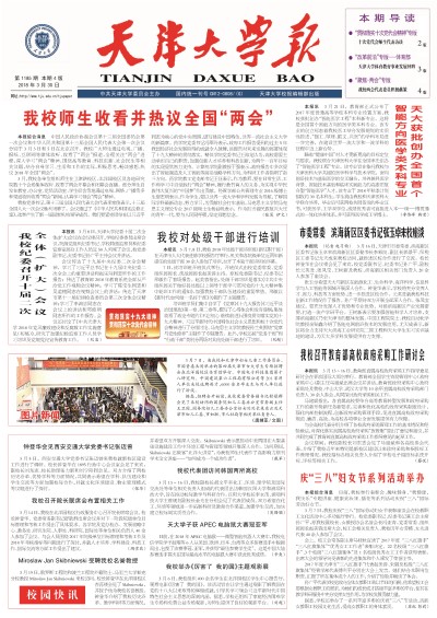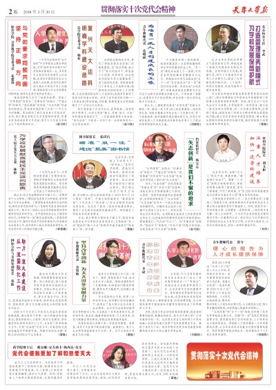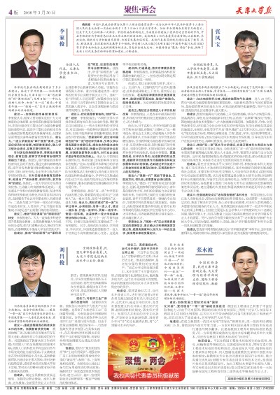 中国人民政治协商会议第十三届全国委员会第一次会议和中华人民共和国第十三届全国人民代表大会第一次会议分别于3月3日和5日在北京召开。2018年全国两会具有非凡的意义,这是十九大之后的第一次两会。中国将站在新的起点,为决胜全面建成小康社会迈出坚实的步伐,开启夺取新时代中国特色社会主义伟大胜利的新征程。我校两会4位代表委员分赴首都,认真履职,参政议政,踊跃发言并积极递交提案,为国家发展出谋划策。我校代表委员的观点建议涵盖了教育、民生、精准扶贫、京津冀协同发展等多个领域,并受到《人民日报》《光明日报》《中国青年报》《天津日报》等多家中央和地方主流新闻媒体的关注,引发社会较大反响。本报特推出“聚焦·两会”专版,撷取了我校4位代表委员的部分提案和建议,以飨读者。