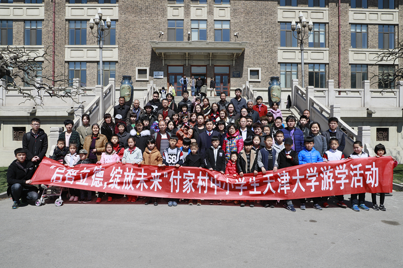 2018年海棠季,天大赴甘肃、贵州、云南等地扶贫创业实践队创业成果展示和产品推荐在北洋广场进行了集中展示。与此同时,天津大学驻静海区付家村工作组带来了盆栽蔬菜展示,并带领付家村中小学生游览天大校园。天津大学校长钟登华看望天津大学的扶贫干部,并和静海付家村的孩子们合影留念。