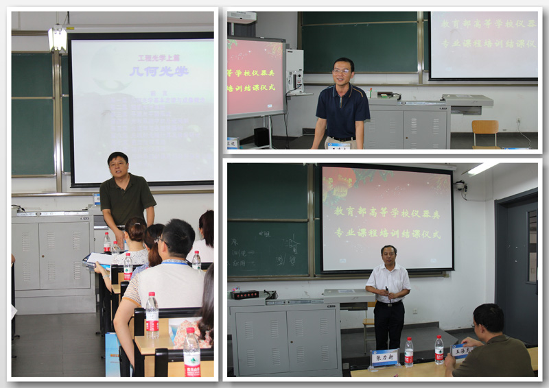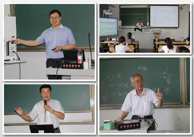 《工程光学》课程培训由天津大学光学工程学科带头人、国家级教学名师郁道银教授主讲,在培训中他讲解了几何光学课程的主要内容及其关联性、教学难点等,也分享了如何讲好几何光学课程的经验。天津大学光电信息技术教育部重点实验室副教授吕且妮讲授了干涉衍射中的重要问题及应用、物理光学中的理论分析与模拟验证等内容。实验课程中,天津市级教学名师、《工程光学》国家精品共享课程负责人蔡怀宇教授为培训教师带来了“《工程光学》课程的实验体系构建与实验设计”的精彩报告,随后培训教师在天津大学光学与光电子技术实验室完成了“透镜焦距、截距的测量实验等”、“望远系统参数的测量”、“迈克尔逊干涉仪的调整及应用”等工程光学经典实验。