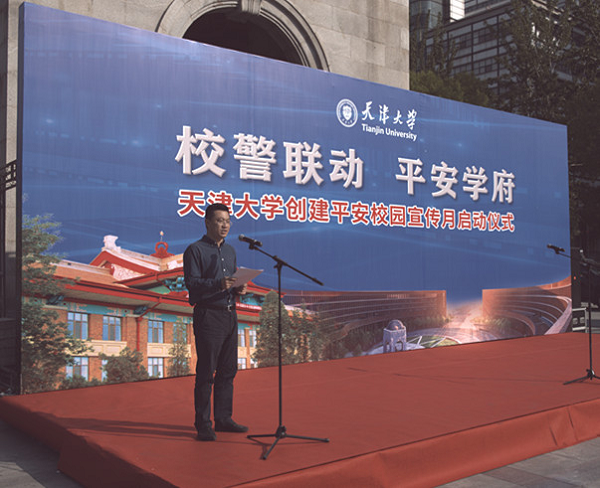 下午15时,仪式正式开始,活动由保卫处处长袁惠龙主持。仪式上,三名学生代表先后讲述了我校见义勇为的感人事迹和防范电信诈骗的相关知识,并代表大学生治保会向全体师生发出遵纪守法、拒绝“黄赌毒”、防范电信诈骗、警惕传销陷阱、注意交通安全以及消防安全等倡议。此前,学校专门成立了“小红哨”社区法律援助队,并在学府街派出所挂牌“天津大学学生社会实践基地”。