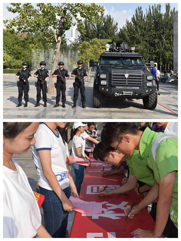 期间,市公安局金鹰反恐防爆突击队现场展示特警车辆以及装备并进行了精彩纷呈的反恐演练,增进了师生对于公安警备工作的认知,提振了对安全保卫工作的信心。由我校学生社团大学生治保会制作的安全宣传图片展,引来了同学们的驻足围观,治保会队员热情洋溢地为同学们讲解安全防范知识,得到师生的广泛认可。
