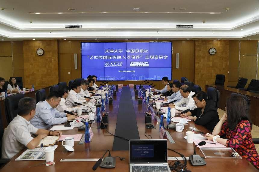 中国日报总编室及天津记者站、事业发展部、21世纪报社,天津大学党委宣传部、党委统战部、人文社科处、国际处、新媒体与传播学院、外国语学院、国际教育学院等相关单位负责人和代表参加签约仪式和座谈交流。