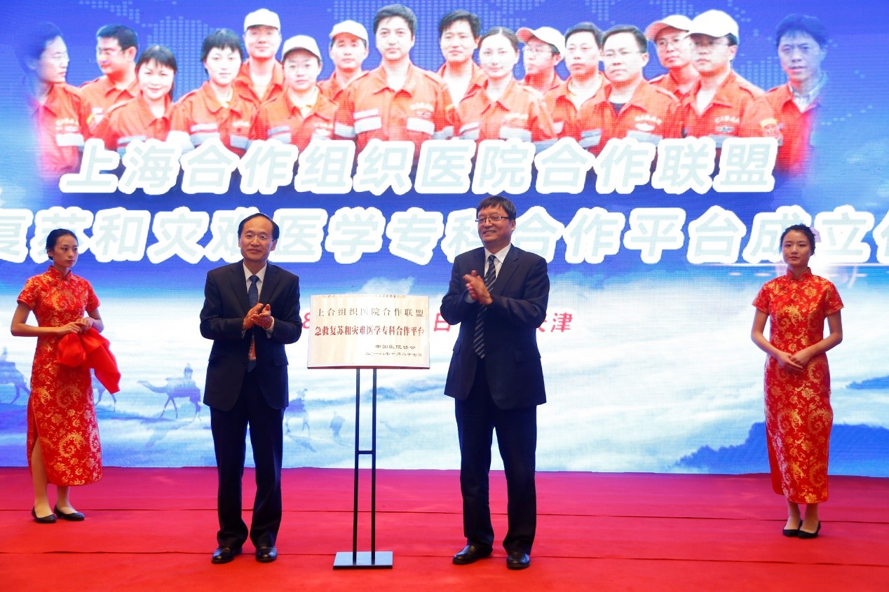 天津大学副校长张凤宝,中国医院协会副会长温浩,国务院应急管理专家组组长闪淳昌,中国工程院院士、中国武警总医院原院长郑静晨,中华医学会灾难医学分会主任委员、天津大学灾难医学研究院院长侯世科,中国医师协会急救复苏和灾难医学专业委员会主任委员、天津大学灾难医学研究院副院长樊毫军以及天津大学相关领导出席了会议。侯世科介绍了平台前期筹备情况,温浩介绍了上合组织医院合作联盟的基本情况,两人一同为上合组织医院合作联盟急救复苏和灾难医学专科合作平台揭牌。
