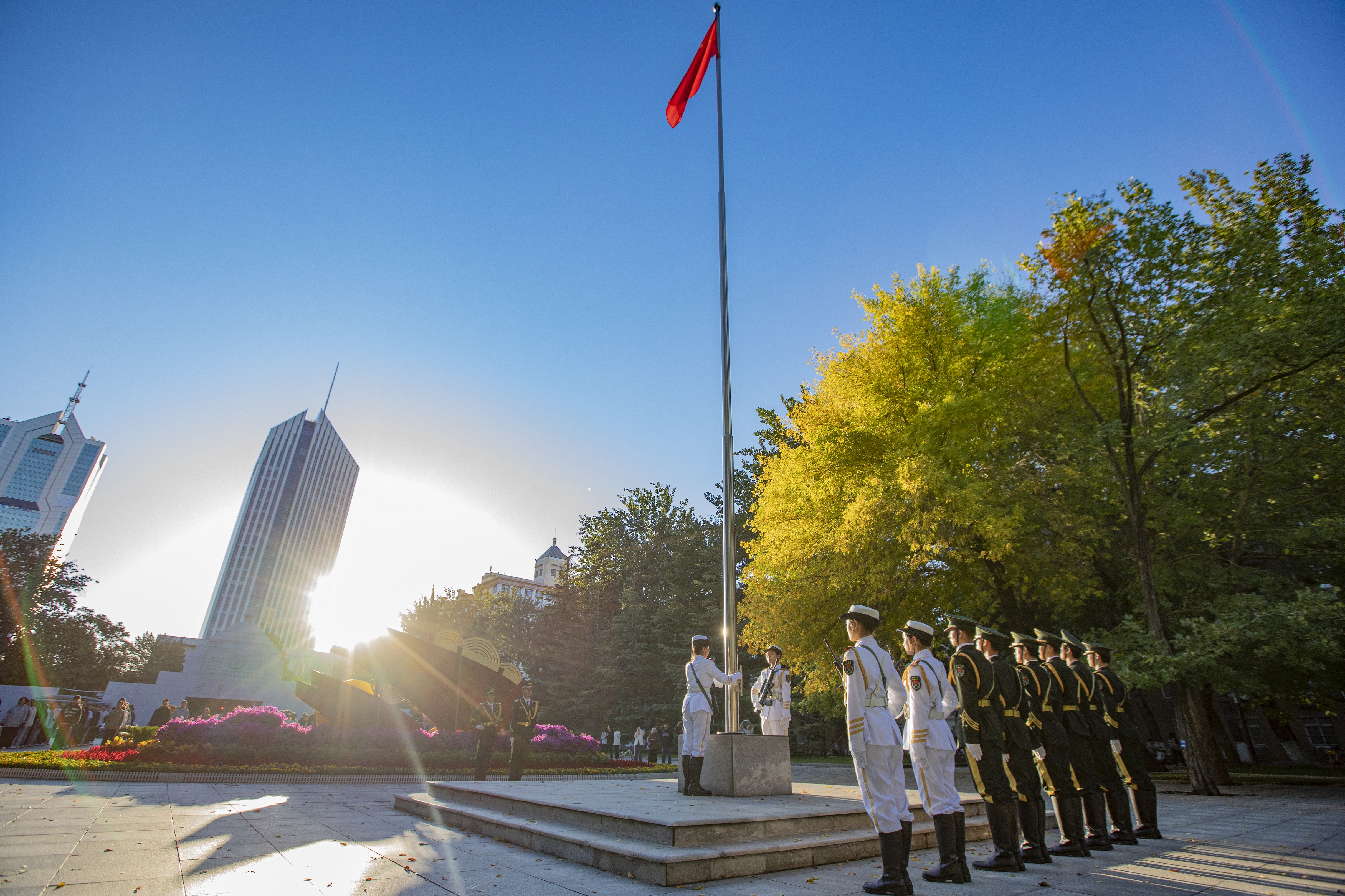 10月1日清晨,天津大学在双校区举行国庆升旗仪式,上千名师生共同见证这一伟大而庄严的时刻。伴随着响亮的口令,校国旗护卫队队员身姿挺拔,迈着整齐划一、铿锵有力的步伐,护送国旗至升旗台前。雄壮的《义勇军进行曲》响起,在同学们庄严的齐唱中,鲜艳的五星红旗冉冉升起,迎风飘扬。参加升旗活动的学生代表杨博和范芯羽表示,天大学子新时代新征程更应牢记 “兴学强国”的使命,为实现中华民族伟大复兴贡献强大力量。