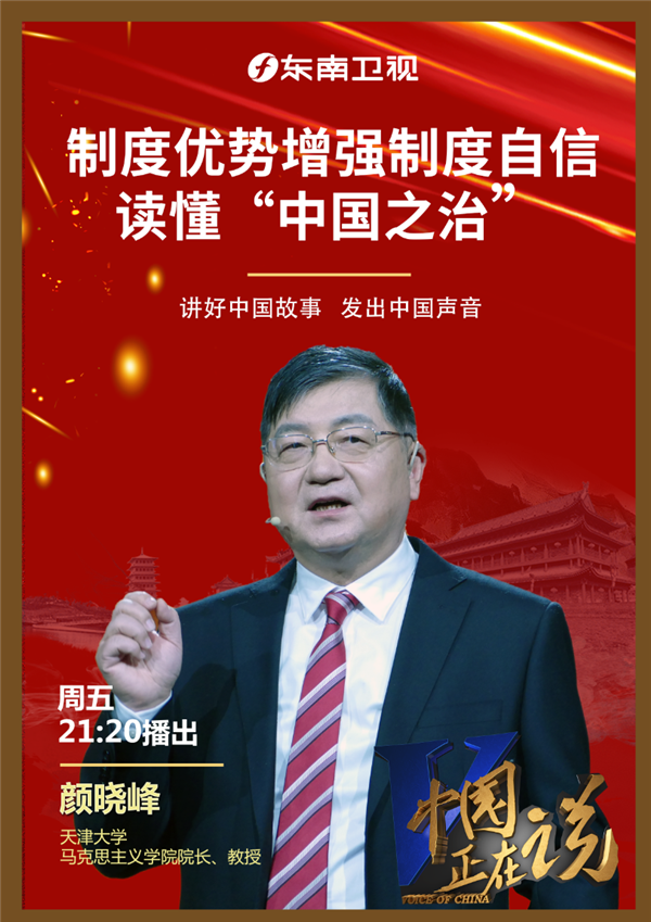 今晚,天津大学马克思主义学院院长颜晓峰教授的主题演讲《制度优势增强制度自信——读懂“中国之治”》将在东南卫视《中国正在说》节目首播,敬请收看。