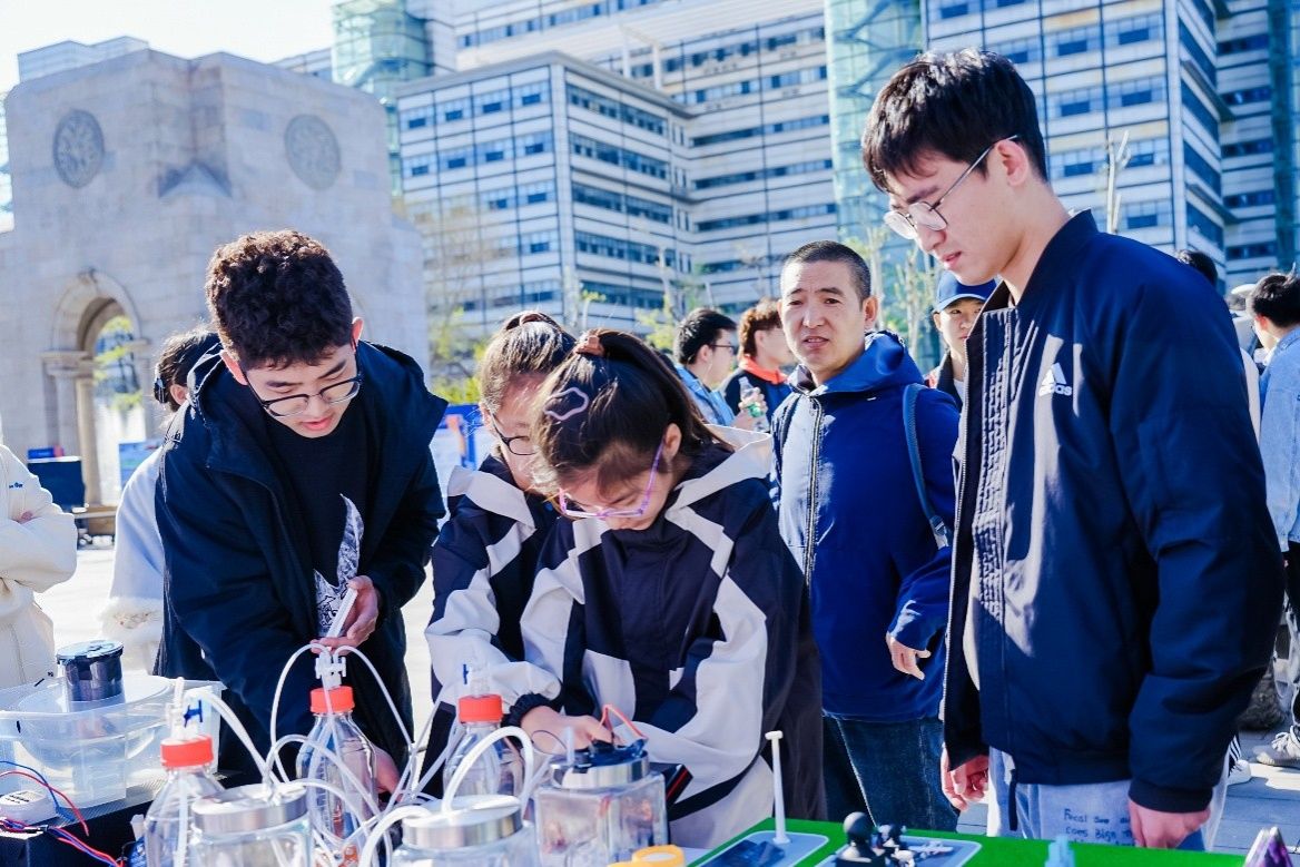 环境学院王宇等学生团队展示了点气成金——低温高纯度二氧化碳捕集装置项目。该项目依托《大气污染控制》项目式课程,聚焦碳减排国家重大需求与行业技术痛点,结合团队在深冷CO2捕集及再利用、工艺优化、余热整合技术等领域的优势,研究和解决了CO2捕集及再利用能耗高的基础理论问题,并成功设计了“低温+膜”耦合碳捕集回收利用系统。现场,项目团队以生动易懂的语言向游客们介绍并演示了项目原理。