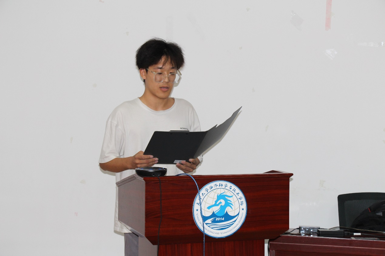 2021级本科生代表贾佳策发言,他回顾了刚入学时班主任和“师友”导师陪伴自己适应大学生活,帮助自己寻找适合的学习方法,寻找未来专业领域的过程。在导师的引导与帮助下,他选择了最有发展潜力,也是最适合自己的海洋学院。