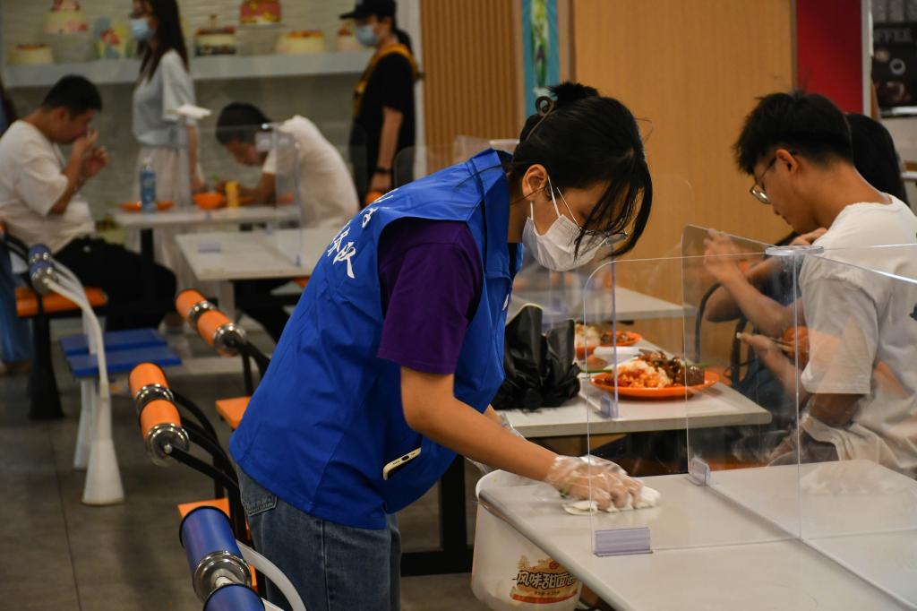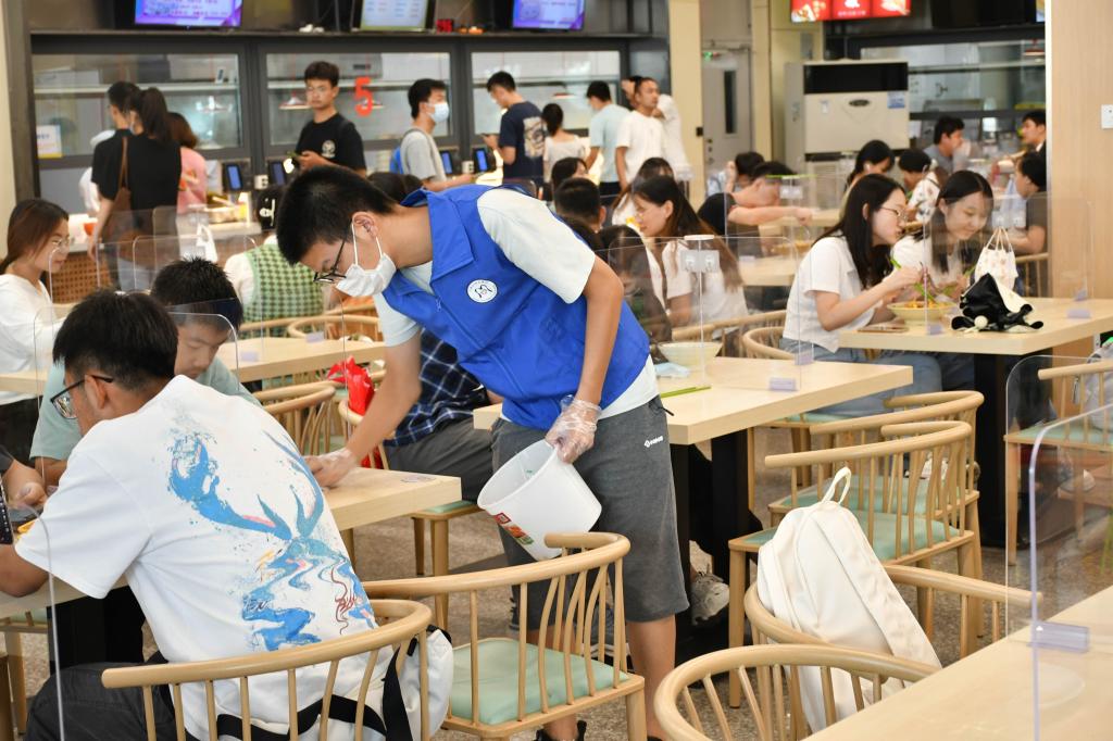 “我知盘中餐”专项校园文明志愿服务活动深入食堂一线,主要负责在食堂的餐盘回收处进行餐盘的整理、清洁食堂内的桌面等工作,在服务奉献中切实体验食堂工作者的日常工作。