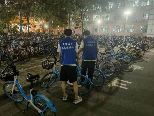 “单车回家”专项活动针对卫津路校区鹏翔公寓夜间共享单车摆放混乱的问题而设置,通过组织志愿者开展单车摆放整理、指引学生文明停车等工作,加强志愿者自身的规则意识与责任心。