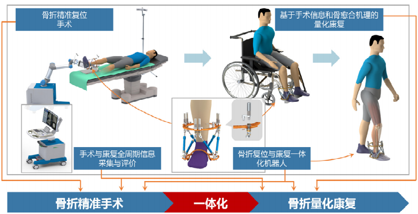 但在临床上,目前下肢骨折复位与康复临床存在着复位精度差、力/位反馈缺失、复位/康复脱节、康复盲目化和康复周期长等问题。针对这些问题,该团队提出利用机器人技术实现骨折精准复位和术后量化康复的一体化理念。围绕该课题,他们研制出了世界首款重量小于2kg的可穿戴式骨折手术与康复一体化机器人,并形成了与之配套的骨折复位轨迹规划软件。该套系统可以实现1.1mm和1.2°以内复位精度,有效提高骨折复位的效果。
