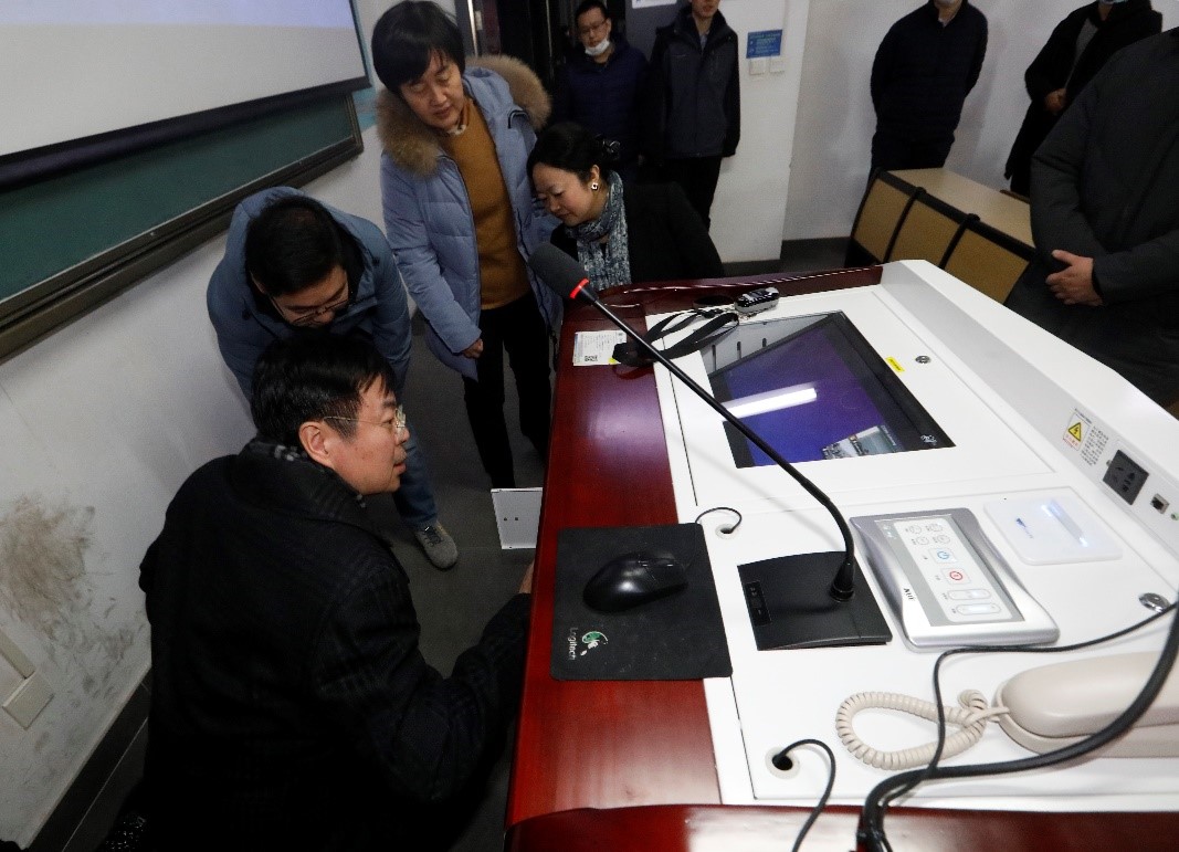 金东寒首先来到第26教学楼B315教室了解教学设备功能和使用操作,听取了远程视频互动教室及普通多媒体教室标准化建设的工作汇报,以及疫情防控期间远程视频互动教学工作方案制定情况的汇报,肯定了有关部门在暑假期间紧急改造新老校区远程视频互动教室,为双校区互动教学提供技术支撑等举措。