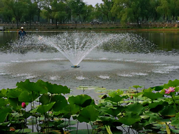 曝气喷泉是结合河道、湖泊等景观水体治理增氧的需求以及喷泉造景而呈现的,在水体净化方面有着独特的优势,它能使水体产生垂直循环运动,破坏热层结,从而增加水体溶解氧,促进水体流动;同时具有喷泉景观效果,增添了湖面颜值。