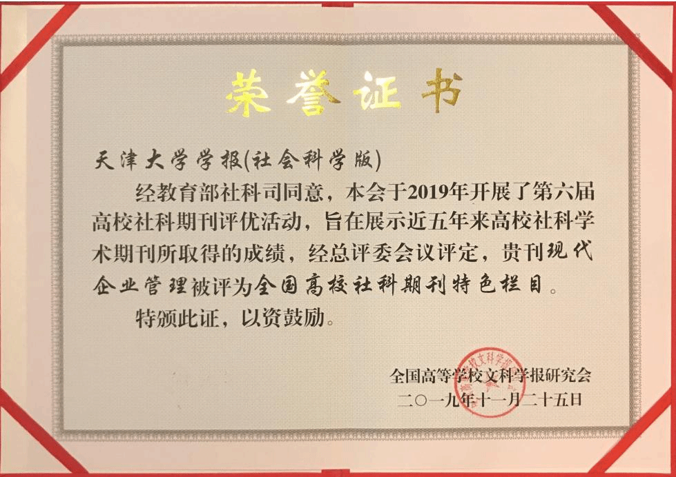 本站讯 2019年11月26日,在全国高等学校文科学报研究会开展的第六届全国高校社科期刊评优活动中,《天津大学学报(社会科学版)》荣获“全国高校社科优秀期刊”荣誉称号,“现代企业管理”栏目被评为“全国高校社科期刊特色栏目”。