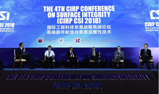 在随后举行的专家讨论环节中,来自中国、德国、英国、美国、日本的5位该领域基础及应用研究国际知名学者受邀上台入座,结合所在团队研究方向,重点针对目前表面完整性研究所面临的关键问题、未来发展趋势,展开了深入和富有远见的讨论。