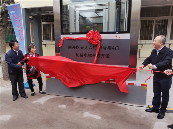 仪式最后,张凤宝、罗进飞、陈文利和居民代表李宛平共同为加装电梯进行了揭牌,宣布天大六村加装电梯正式建成并投入使用。