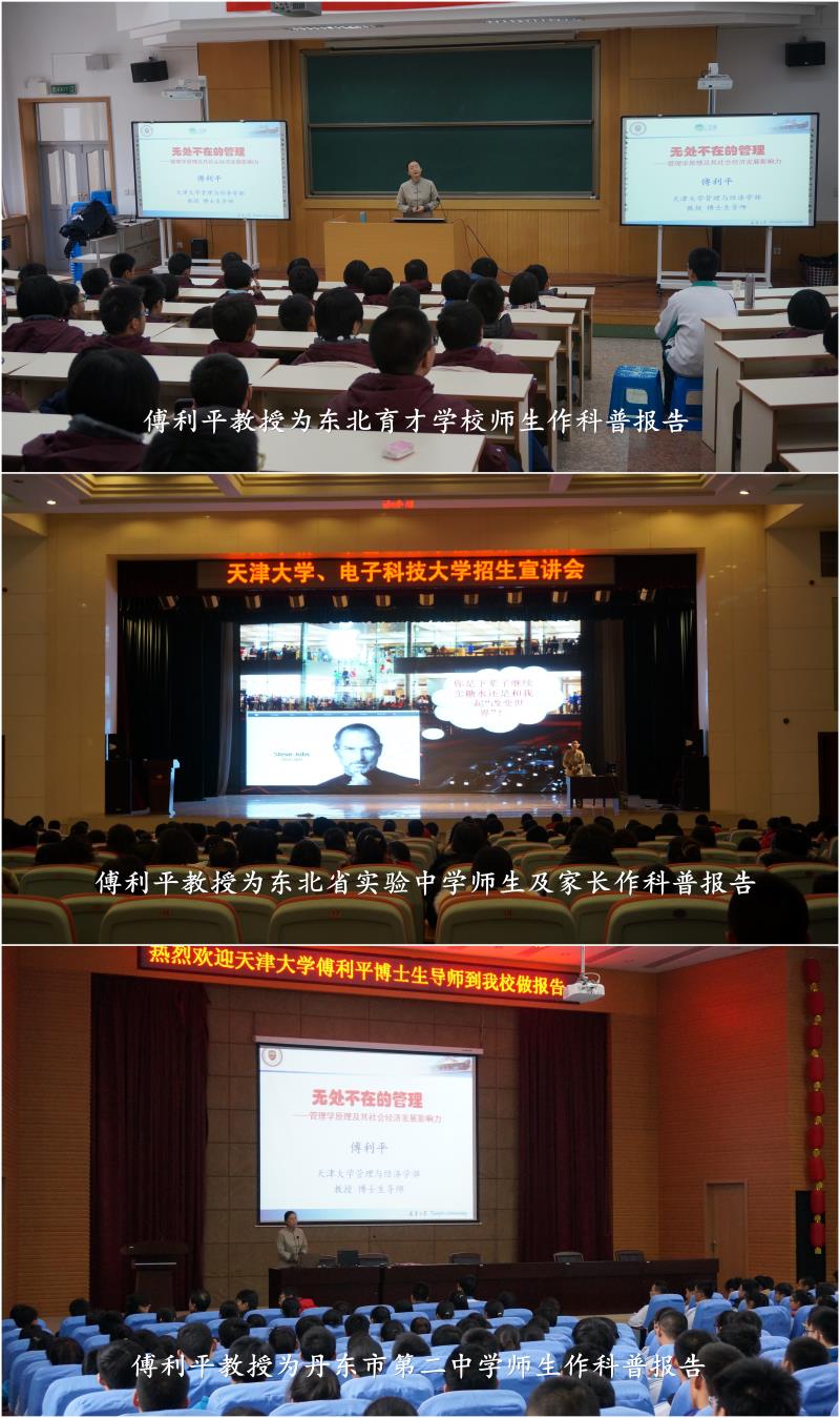 11月25日,傅利平分别为东北育才学校和辽宁省实验中学师生作题为《无处不在的管理》的科普报告。傅利平从身边的案例出发,深入浅出地为广大师生奉献了一场精彩的管理学报告。报告后,针对师生、家长的提问,我校工作人员进行了详细地解答,鼓励优秀学生报考我校。