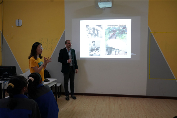 罗润泽教授在备课过程中了解到宕昌县的药用菌菇资源非常丰富,结合当地特点精心进行课程设计和准备,他从学生们身边的最熟悉最常见的食用菌菇讲起,从他在非洲指导当地居民利用干草和海带种植药用菌菇的科研经历讲到生态环境保护理念,深深吸引了学生们。在纳米比亚海岸线上临近沙漠的干旱地带,教授因地制宜创新蘑菇养殖方法,将随处可见的干草与海带变成养殖肥料;在意大利蝙蝠体内发现的白色致病真菌,竟然也是药用真菌的一种;极端环境下动植物无法生存,却能微型真菌的足迹……他所讲述的种种真菌世界的神奇之处,让这些极少接触生物实验的孩子们雀跃不已。