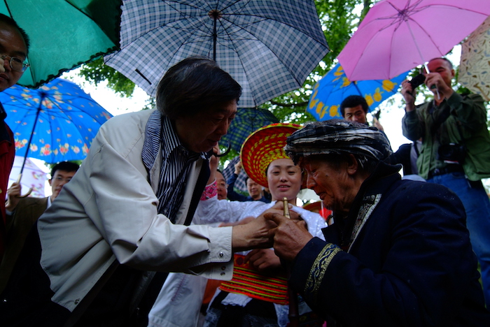 在湘中花瑶的村寨里给保护参天古树的老村长敬烟