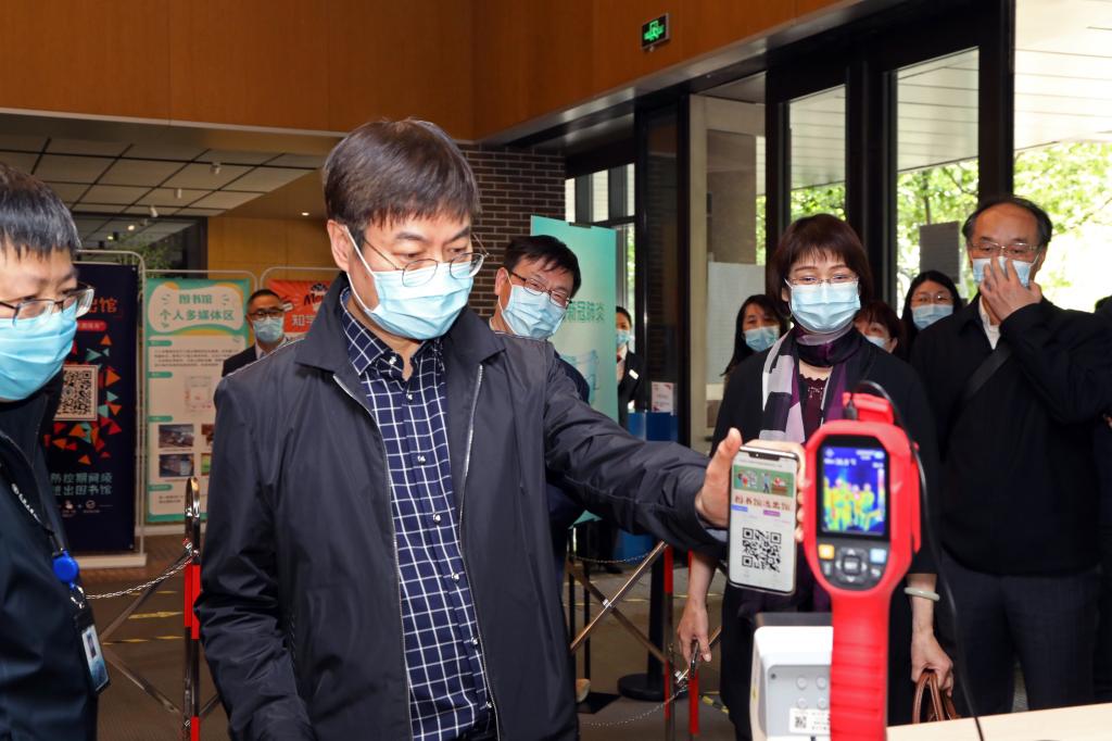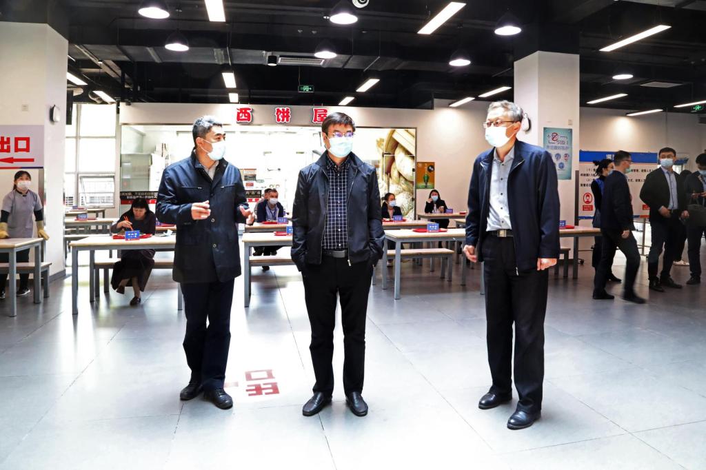 扫码、测温、标语提示、一米线排队、菜单公示……梅园餐厅内,正值中午用餐时间,在工作人员和志愿者的引导下,食堂内秩序井然。综合超市内口罩等防疫物资齐全。在学生宿舍,金东寒一行重点考察了学生住宿安排、宿舍区防疫措施和防疫物资存储等环节。在图书馆和体育场,重点考察了场馆限流措施、图书及运动器械防疫消毒措施等。在大型地震工程模拟研究设施建设现场,详细了解了建设工地现场防疫措施及项目建设进展情况。