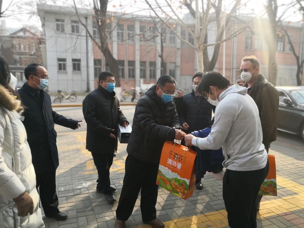 探望最后,李旭炎、赵剑岭代表市委、市政府向两位外籍专家赠送了医用口罩等疫情防护和生活物资。