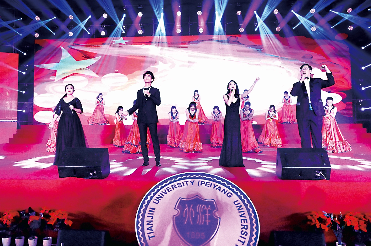 由教授、科研团队教师、扶贫干部、辅导员、研究生支教团等代表组成的表演团队和北洋艺术团的同学们共同演绎了《我们都是追梦人》,意寓每一名“天大人”都在自己的岗位上向着中华民族伟大复兴的“中国梦”奋力奔跑。