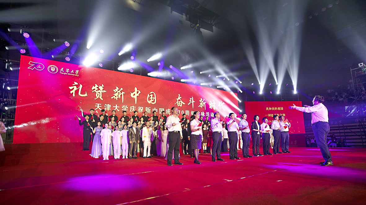 全场起立,在巨型国旗和巨型条幅的映衬下,师生共同合唱《我和我的祖国》和《天津大学校歌》,祝伟大祖国繁荣昌盛,祝天津大学蒸蒸日上。