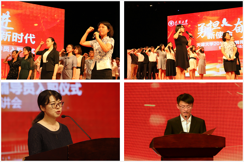随后,国旗护卫队护卫党旗、校旗入场,在党的十九大代表、天津大学药学院党委书记冯翠玲,天津市十佳辅导员、经管学部学工办主任尚洁的带领下,新辅导员们重温了入党誓词,并在《高校辅导员誓词》中宣誓入职。数学学院辅导员孙鸿鹏与精仪学院学工办主任焦璇分别作为新入职辅导员代表和优秀辅导员代表发言,分享了他们选择辅导员岗位的初衷和对于这份职业的挚爱之情。