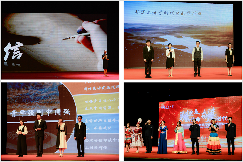 入职仪式后,新老辅导员合作,为在场师生奉献了精彩的专场宣讲会。杰出校友张太雷的一封家书,王镭教授夫妇遗体眼角膜“双捐”的背后故事,张毅、王炳诚校友对母校学弟学妹的深情寄语,三封书信在辅导员的演绎下,感人至深、催人泪下,生动展现了天津大学123年办学历程中,天大人所坚守的爱国奉献优良传统,诠释了何为“天大品格”;追根溯源从中国丰厚的历史文化谈起,抽丝剥茧生动阐释中国特色社会主义价值观,结合中国发展谈青年的时代责任和历史使命,用美好蓝图激励青年坚定信仰一往无前,四位辅导员的思政“微”课堂,诠释了何为“青年使命”;蒙古族民歌雄厉悠扬,新疆民族舞蹈热情欢快,精彩的各民族歌舞表演,谱写了社会主义现代化建设的“时代新篇”。
