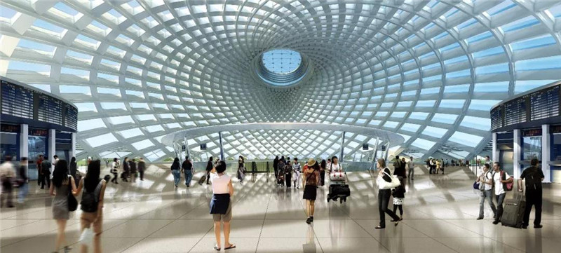 于家堡站地面站房采用“贝壳”建筑设计方案,其灵感来源于鹦鹉螺和向日葵的螺旋线,从圆形双向螺旋网格拉伸出初始平面形态,通过数值“悬挂”形成初始形体,再反转得到贝壳形壳体,形成通透、开敞、明亮、新颖的建筑空间,达到了结构与建筑的完美统一,已成为滨海新区的地标建筑。